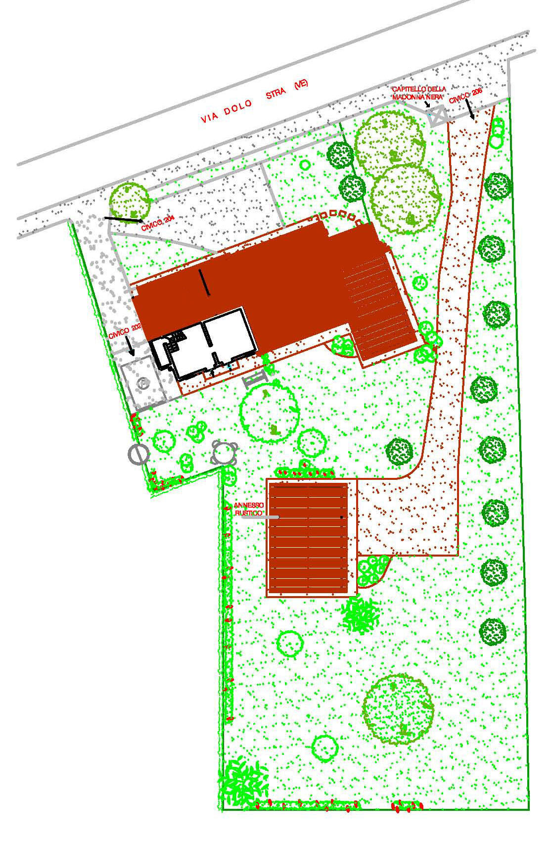 La casa, che prende il nome di "Casa Capitello" in quanto è a ridosso del Capitello della Madonna Nera della fine del XIX secolo, si sviluppa lungo la via Dolo: da un lato scorre il Naviglio Brenta, dall'altro si estende il giardino, con il suo ricovero attrezzi agricoli e oltre la campagna coltivata.